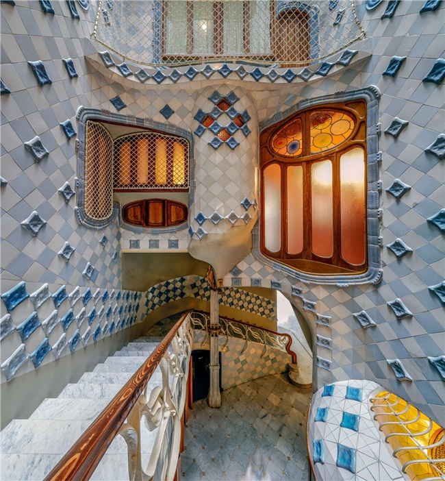 在今天的运营中,巴特罗之家通过修复工程进一步尊重并恢复高迪原始的材料与色彩:包括近期对后立面与贵宾楼层庭院的整体修复,采用传统工艺恢复玻璃与陶瓷拼贴、铁艺阳台、木制门窗以及由约8.5万块Nolla马赛克拼成的地面铺装。该项目大量依托本地工匠技艺,在保护建筑原貌的同时响应了对传统技艺与低碳工艺的双重尊重。