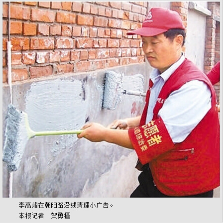 后来,李高峰到朝阳区八里庄街道流管办上班,但义务清污的活儿一直没落下。每天早上5点起床,清理社区的死角、小广告、厕所,下雨天还会清理下水道。8点上班,给流动人员办理暂住证,休息时间用来清理脏乱死角和解决民事纠纷。晚饭后,义务巡逻到零点以后。刮风下雨从来没间断过。