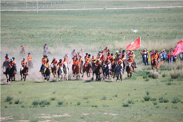 上午9时,来自北京、山东、山西、江苏等地和内蒙古自治区本地的90对人马组合齐聚赛道起点,等待开赛发令枪响起那一刻。本次比赛赛程为26公里,赛事组委会规定,所有的参赛骑手年龄都必须在15周岁以上,这是为了保护骑手的安全和维护比赛公平而设置的规定。在中国广袤的草原上,很多孩子都是在马背上长大的。可能在他们还不太会走路的时候,就已经可以骑马了。因此,在很多传统的民族赛马中,参赛的小骑手非常之多,但也不时会有小骑手因控马能力差而意外落马受伤的。 随着开赛令枪一响,起点处绿色的马栅一倒,群马奔腾而出。霎时间,草原上风雷浩荡,黄烟滚滚。爆发力极强的英纯血、沙漠之王阿拉伯马等世界名马,也都前来参加比赛。主场作战的蒙古马,虽然身材相对矮小,但它对草原的环境、气候非常熟悉,占尽了主场之利。当它们同场竞技的时候,赛道上便瞬间便变得十分精彩,也令比赛结果变得颇具悬念。