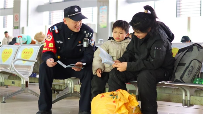 车站是旅客出行的第一站,也是法治宣传主阵地。鹰潭站派出所始终以旅客需求为导向,将法治宣传融入站区各个角落。线上利用led大屏、广播台、小喇叭等载体,高频滚动播放防盗反诈、禁限带物品等预警信息,把安全知识送到旅客面前。线下组织警力在安检口、进出站口设立普法岗亭,针对旅客关心的旅财防范、应急求助等问题,以案释法,耐心答疑。重点聚焦老年群体、学生旅客,重点讲解刷单返利、退票退款等新型诈骗手段,通过真实案例警示广大群众“天上不会掉馅饼”,守护好自己的“钱袋子”。